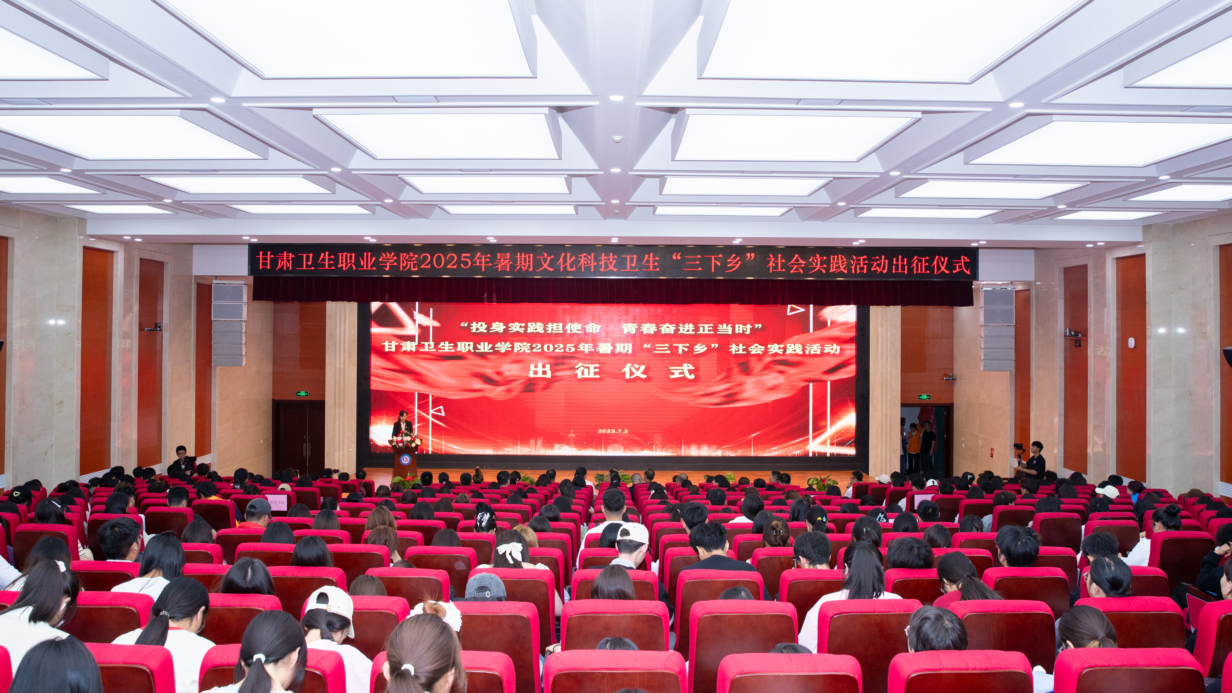 7月2日上午,学校2025年大学生志愿者暑期文化科技卫生“三下乡”社会实践活动出征仪式在笃学楼学术报告厅举行。学校在家校领导,学生工作处、团委、心理健康教育中心、科学技术处全体工作人员,二级学院领导班子、团学负责教师,“三下乡”全体志愿者,学生干部代表共计400余人参加了出征仪式。