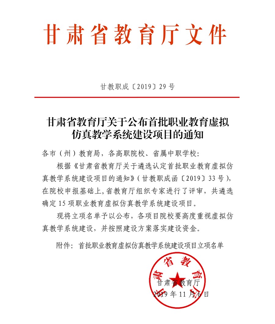根据《国务院关于印发<国家职业教育改革实施方案>的通知》(国发[2019]4号)和《甘肃省教育厅等六部门关于印发<现代职业教育体系建设规划(2014-2020年)>的通知》(甘教厅[2014]74号)精神,今年7月省教育厅决定开展首批职业教育虚拟仿真教学系统建设项目的认定工作,面向资源环境、土木水利、交通运输、智能制造、物流、新能源等领域,认定15个职业教育虚拟仿真教学系统建设项目,省优质高等职业院校推荐3个,其它高职高专院校推荐1个。