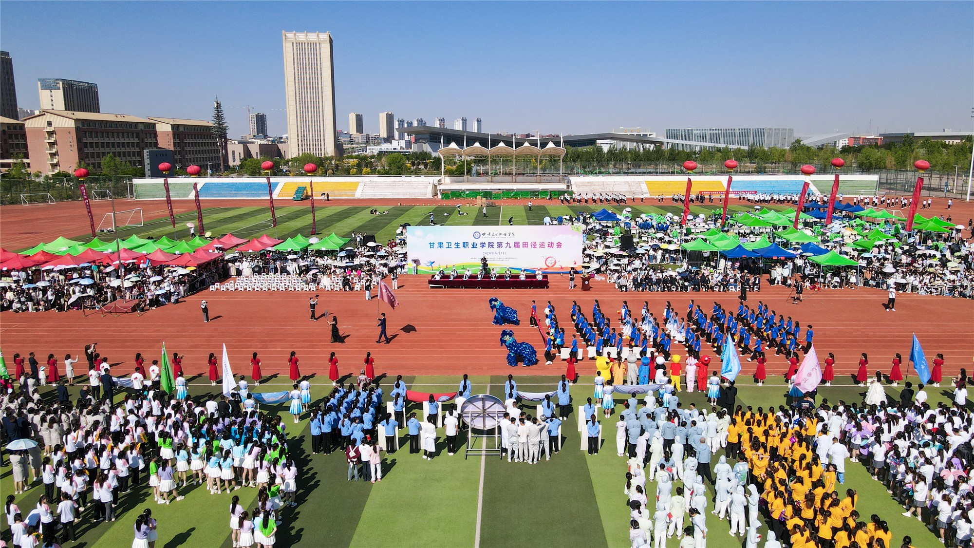 6月5日上午,365英国上市集团官网第九届田径运动会在学校田径场拉开帷幕。全校500余名教职工及8000余名在校生齐聚绿茵场,共同参与这一年一度体育盛事。学校还特别邀请了甘肃省农垦中等专业学校的77名教职工代表观看开幕式。学校党委书记包磊,党委副书记、校长王建成,党委副书记毕效武,纪委书记刘斌,副校长高博、张军荣、邱文云、杨频,农垦中专党委副书记焦颖新、副校长党纯仁、李力及各赞助企业的领导在主席台就坐,开幕式由杨频主持。
