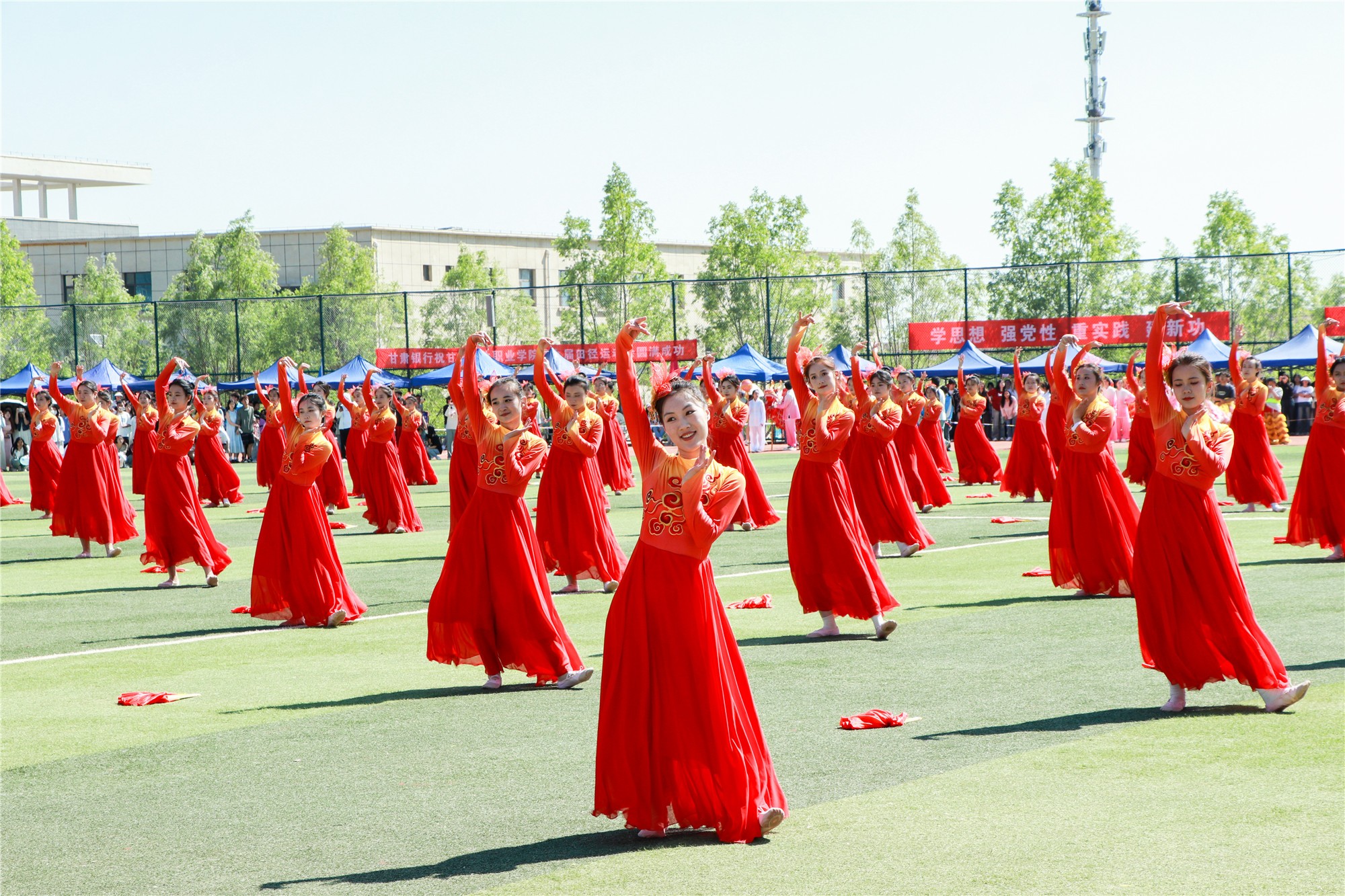 各方队退场后,校团委和各二级学院进行了精彩的节目表演。《春满九州》带来充满无限春意的开场,《龙狮共舞耀中华》中舞龙舞狮伴随着鼓点欢腾舞动,振奋人心,《铿锵鼓乐展英姿》展现了国家非遗文化的传承与弘扬,《我们的未来式》用充满活力的青春舞姿表达了同学们对未来的美好憧憬,最后蒙古舞表演《特斯河之赞》以舞蹈为载体,带领师生体验民族风情,赢得现场叫好连连。