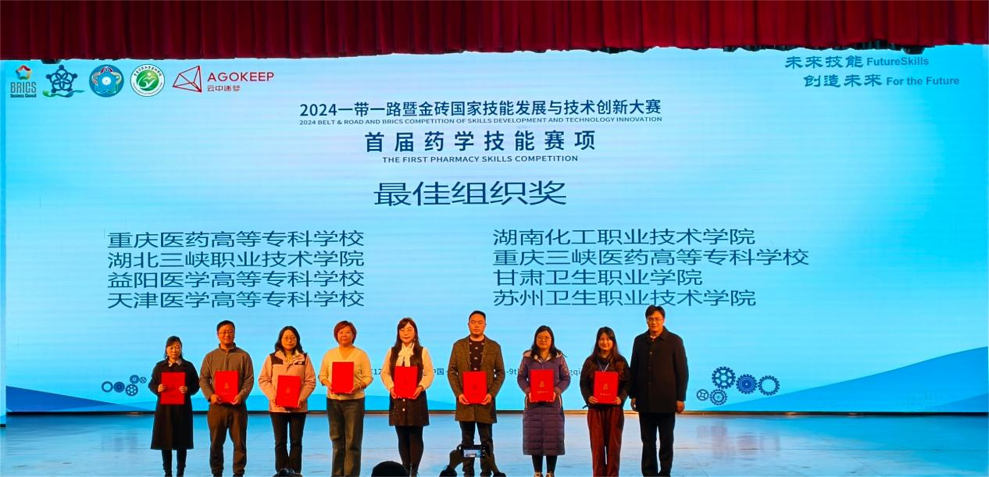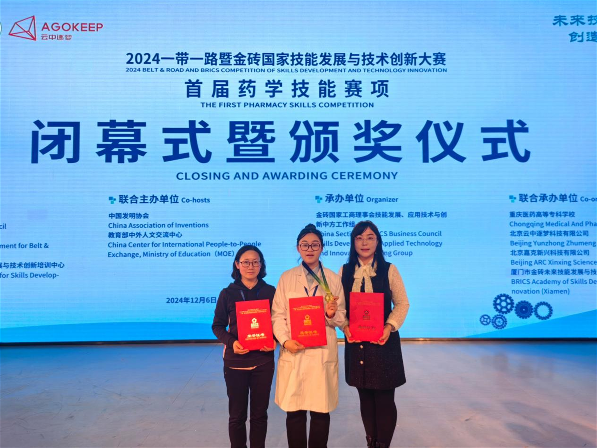 12月6日至9日,“2024一带一路暨金砖国家技能发展与技术创新大赛”首届药学技能赛项在重庆医药高等专科学校圆满落幕。来自全国27个省、自治区、直辖市77所本、专科院校的77名选手同台竞技。经过激烈角逐,365英国上市集团官网药学院选手杨文璐凭借深厚的专业知识功底、出色的临场表现,以总分第六名的优异成绩脱颖而出,荣获金奖,赵小芳老师获优秀指导老师奖,学校获最佳组织奖。