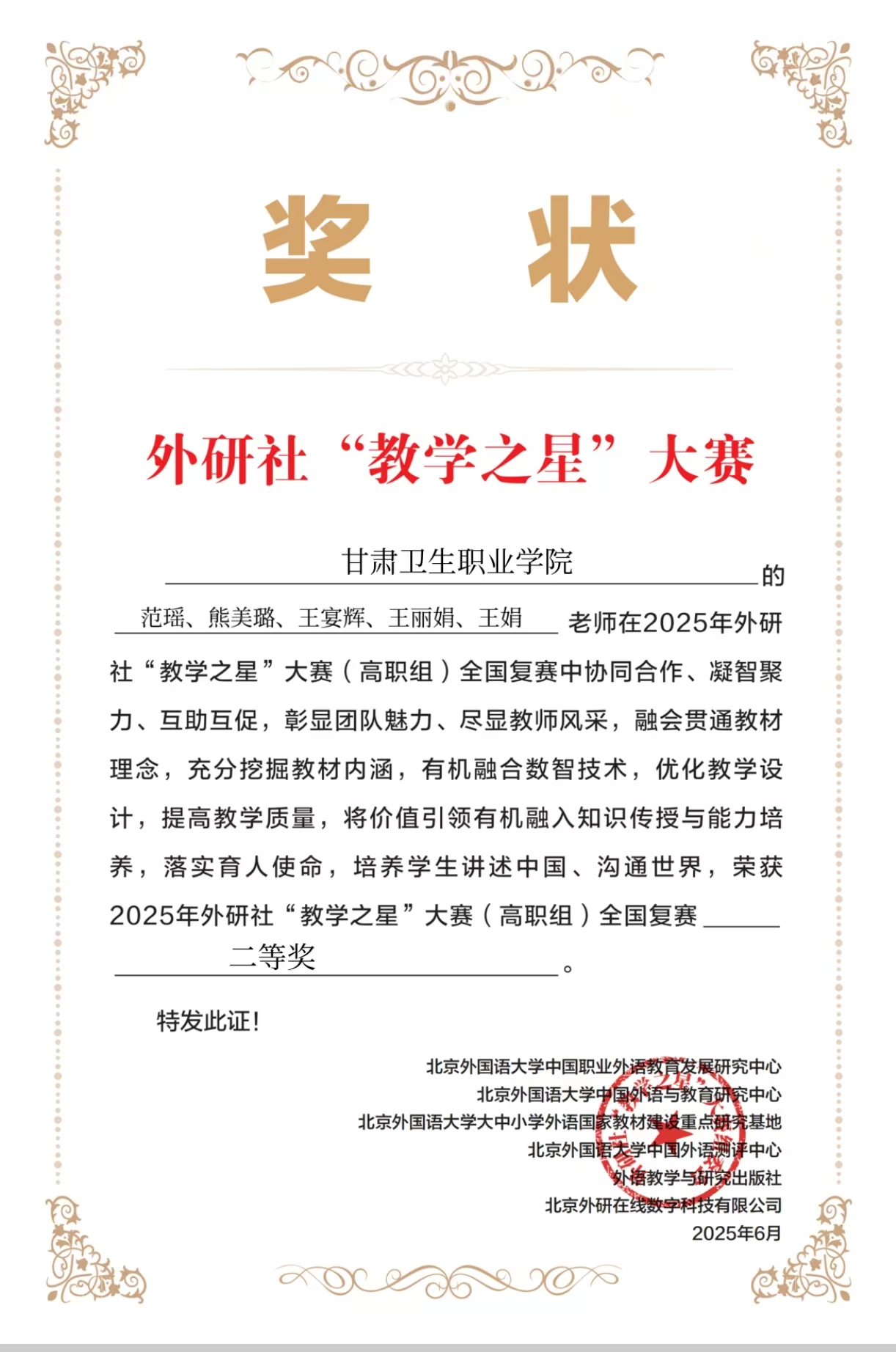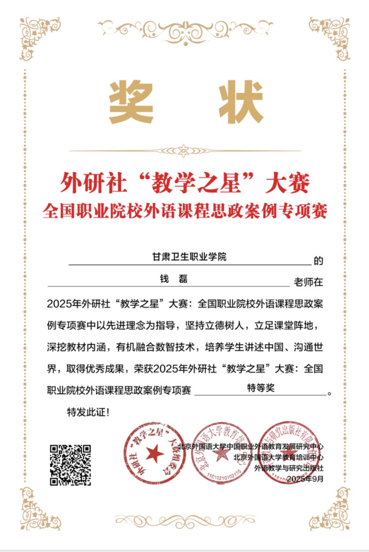 为全面推进职业院校外语课程思政高质量建设,促进职业院校教师落实立德树人根本任务,外语教学与研究出版社于今年启动2025年外研社“教学之星”大赛“全国职业院校外语课程思政案例专项赛”。本次大赛以“外语教材的有效使用:讲述中国,沟通世界”为主题,公共教学部教师钱磊的获奖案例以外语课程中“Hobbies”主题单元为切入点,通过“认知与表达-理解与交流-文化与拓展”系统化的跨文化教学设计,突出了“文化浸润+职业赋能”双路径思政融入模式,实现了语言学习与思政育人的有机统一,获得特等奖;王丽娟老师获得该赛项二等奖。同期范瑶老师团队获得2025年外研社“教学之星”大赛(高职组)全国复赛二等奖,成功展现了外语课程在立德树人方面的创新探索与扎实成效,为同类课程思政建设提供了可复制,可推广的范式。