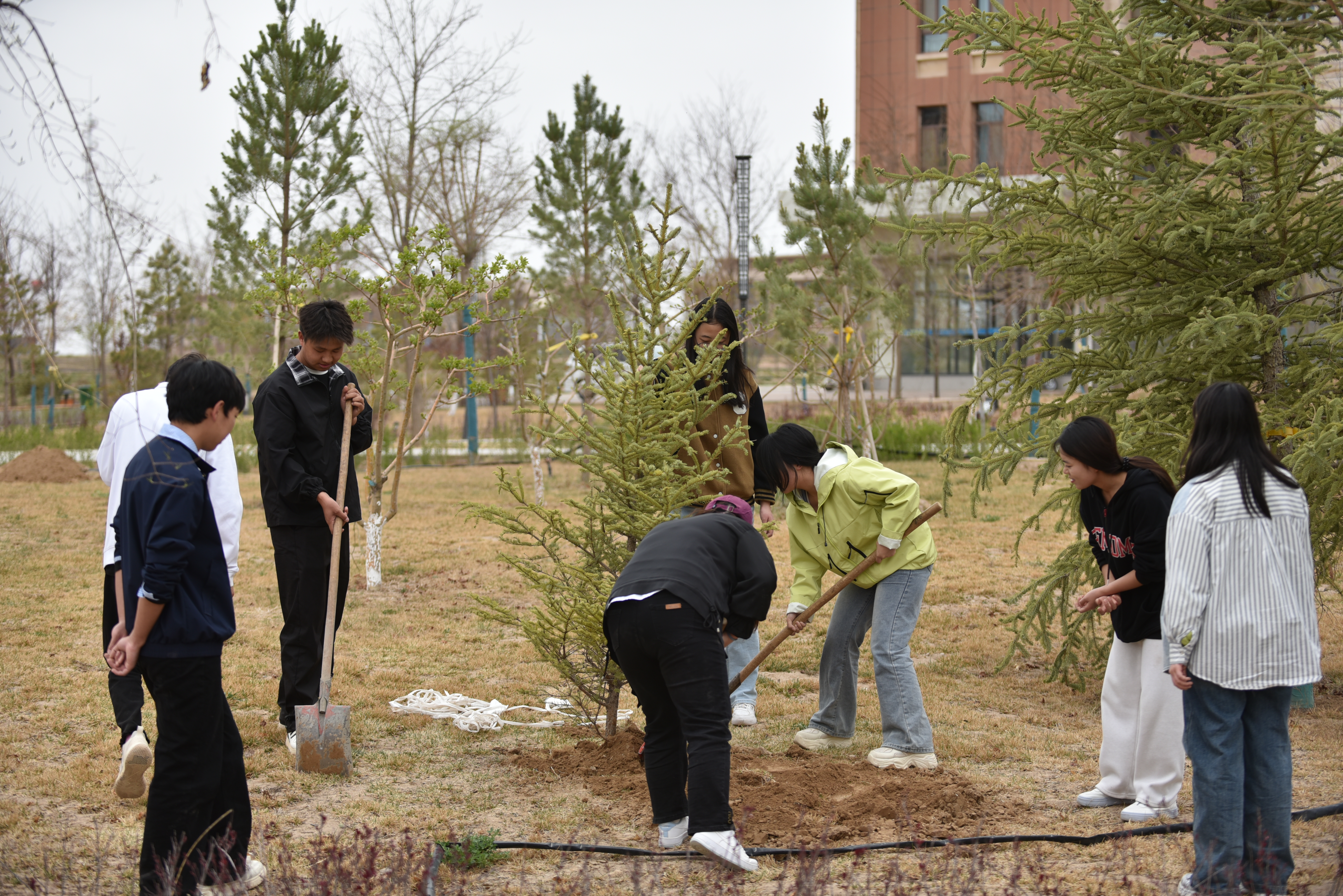 活动现场,师生们热情高涨,分组协作。挥锹铲土、扶正树苗、培实新土、提水浇灌……每一个环节都细致认真。老师们言传身教,向学生示范植树技巧;同学们默契配合,干劲十足。“坑要挖得深些,根系才能舒展”“浇水要浇透,树苗才能扎根”,交流声与劳动声响彻植树区域,一棵棵新苗在春日暖阳中昂然挺立,传递着蓬勃的生命力。