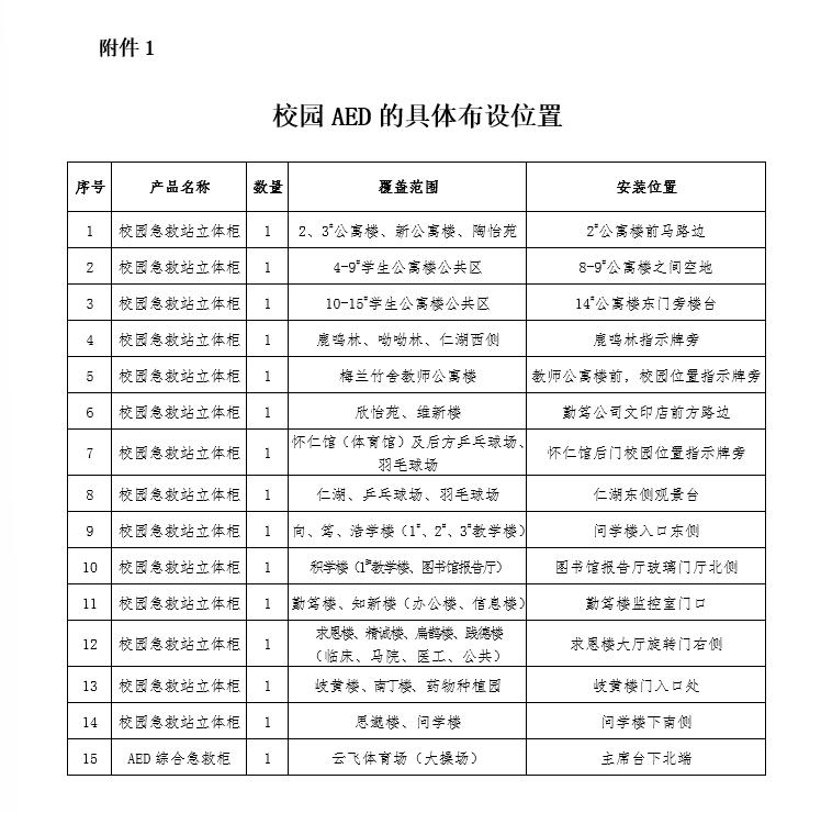 此次安装的15台AED覆盖了校园主要区域,分别设置在教学楼、实训楼、图书馆、学生公寓、体育场馆和食堂等人群集中场所,设备已全部调试完毕,可随时启用。