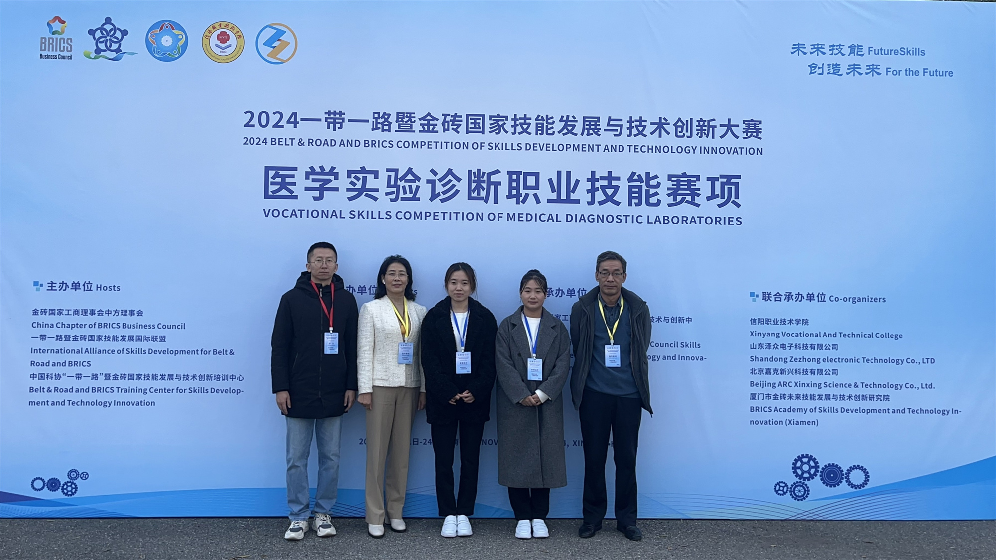 11月21日至24日,“2024一带一路暨金砖国家技能发展与技术创新大赛”首届医学实验诊断职业技能赛项在信阳职业技术学院举办,来自全国各地26个省市区的60所本专科院校的代表队参赛。365英国上市集团官网医学技术与工程学院医学检验技术专业牛爱爱、陈倩倩2名参赛选手凭借扎实的专业知识与精湛的技能操作,荣获三等奖。