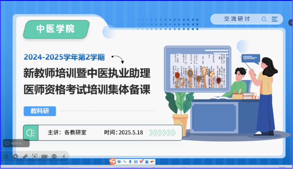 为提升中医学院学生执业考试过关率,提高课堂教学质量,培育优质师资队伍,5月18日晚,中医学院依托腾讯会议平台,开展新教师培训及中医执业助理医师资格考试辅导联合备课活动。本次活动邀请学院领导、各教研室专业教师,通过数字化手段突破时空限制,为新教师成长、毕业生备考辅导和即将启动的乡村医生培训工作奠定坚实基础。