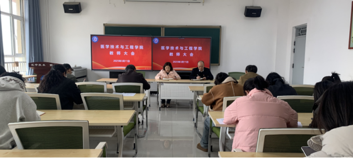 2025年3月11日中午医学技术与工程学院召开第二次教师大会,根据教务处工作安排,全面部署新学期教科研工作。会议由副院长张娅妮主持。