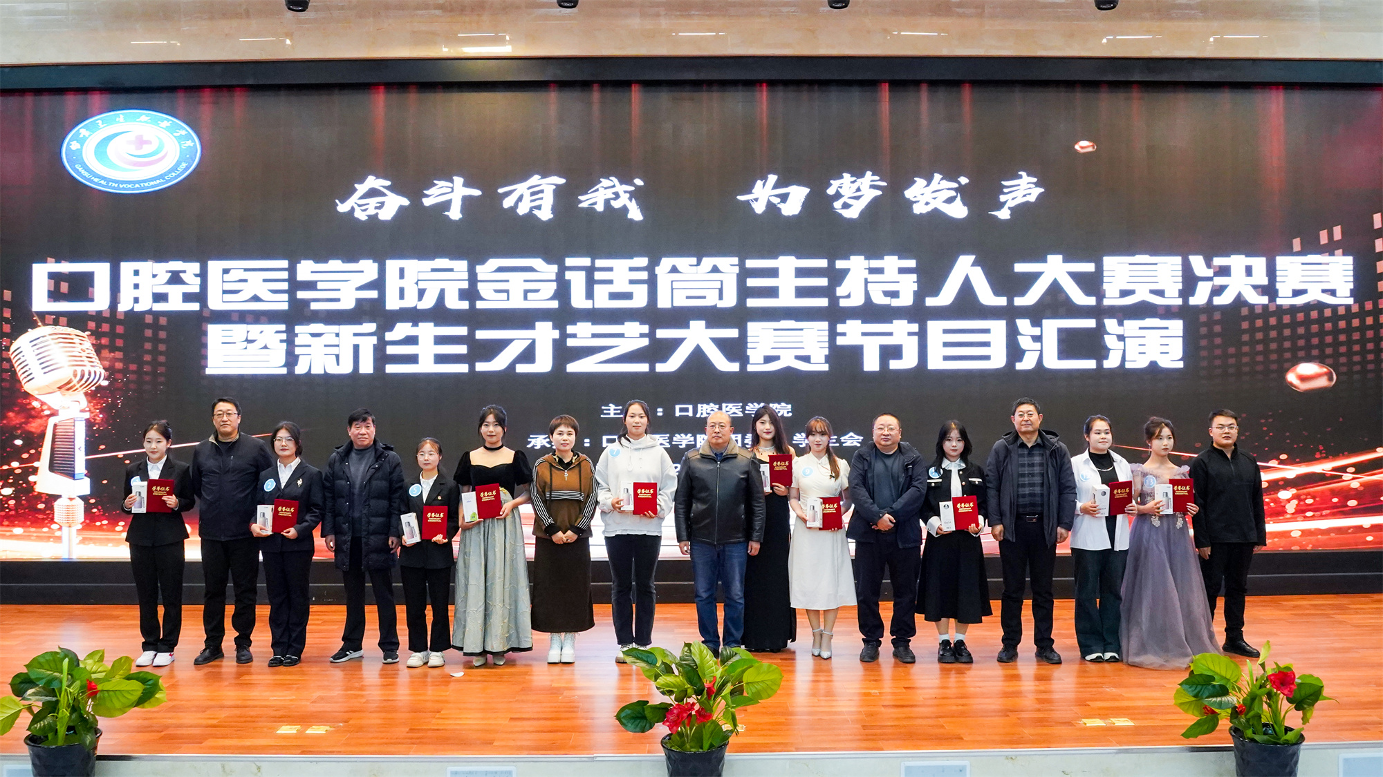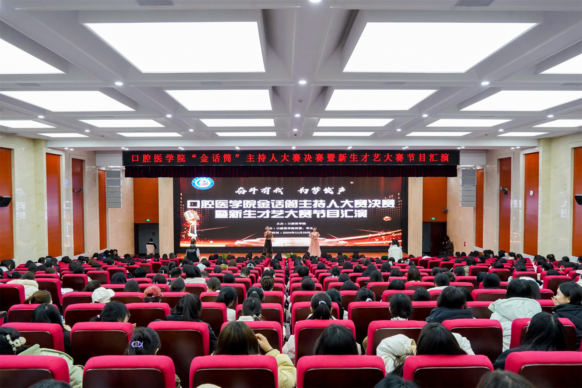 为丰富校园文化生活,展现学生青春风采,锻炼语言表达与交际反应能力,11月26晚19:00,口腔医学院“金话筒”主持人大赛决赛暨新生才艺大赛节目汇演在学校一号教学楼学术报告厅举行。活动邀请党委宣传部、学生工作处、医学技术与工程学院、药学院、护理学院、临床医学院的负责人及老师莅临指导并担任评委。口腔医学院辅导员、学生代表共计四百余人观看了比赛。