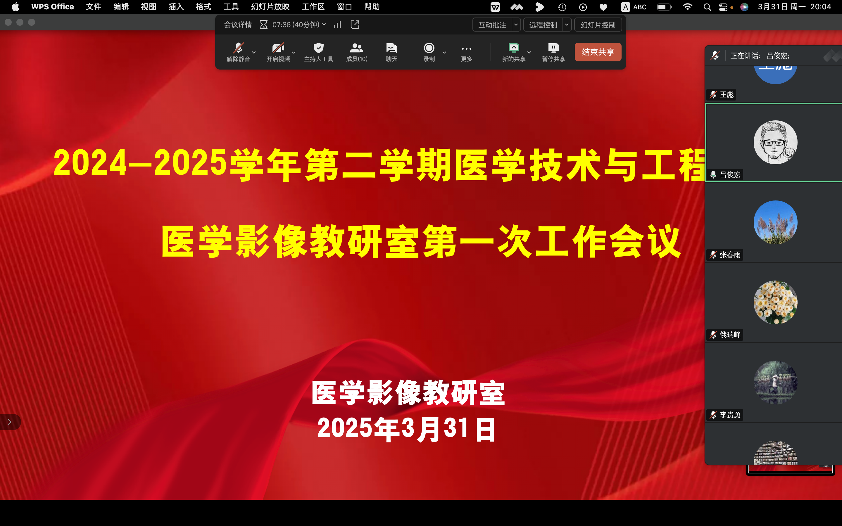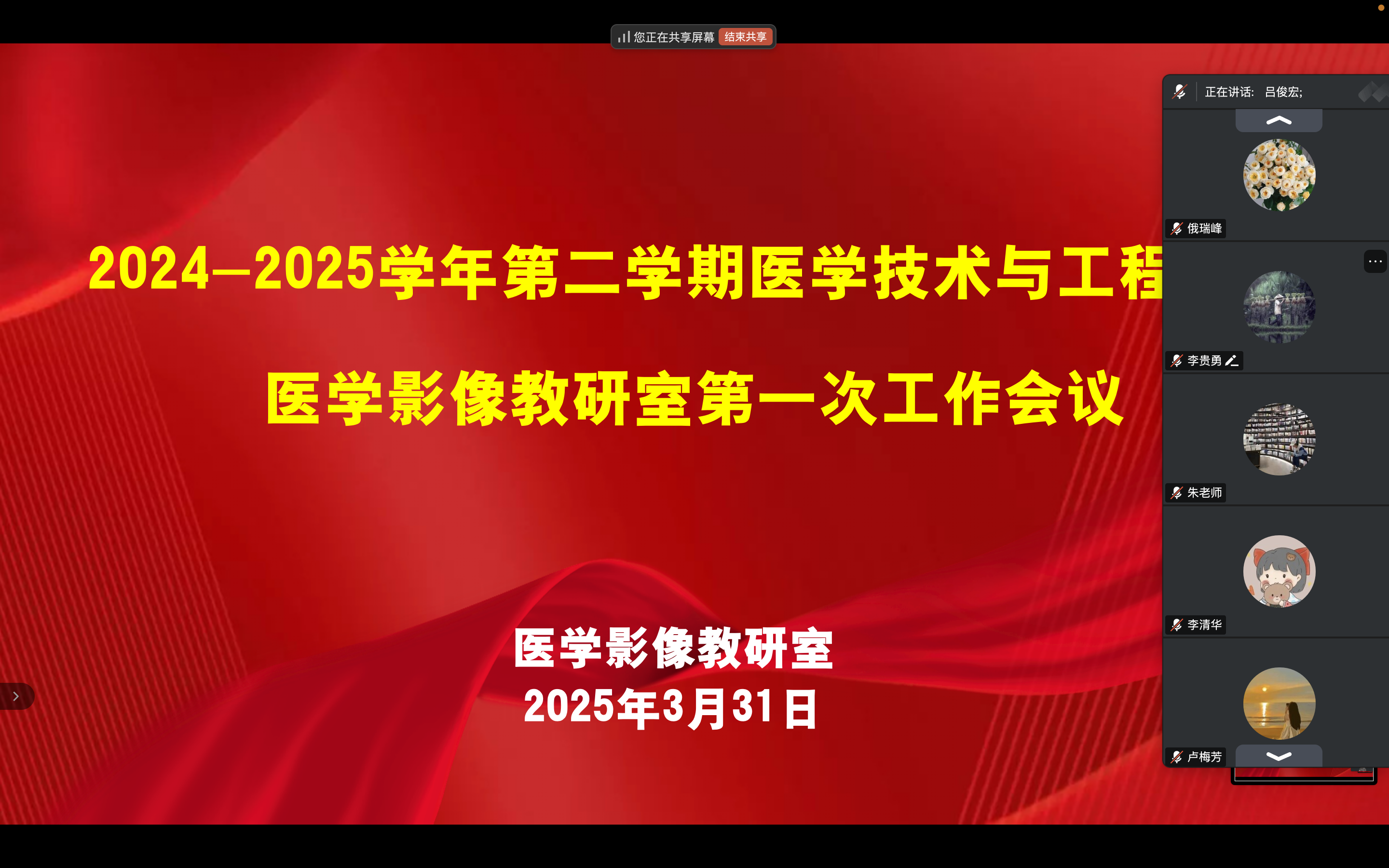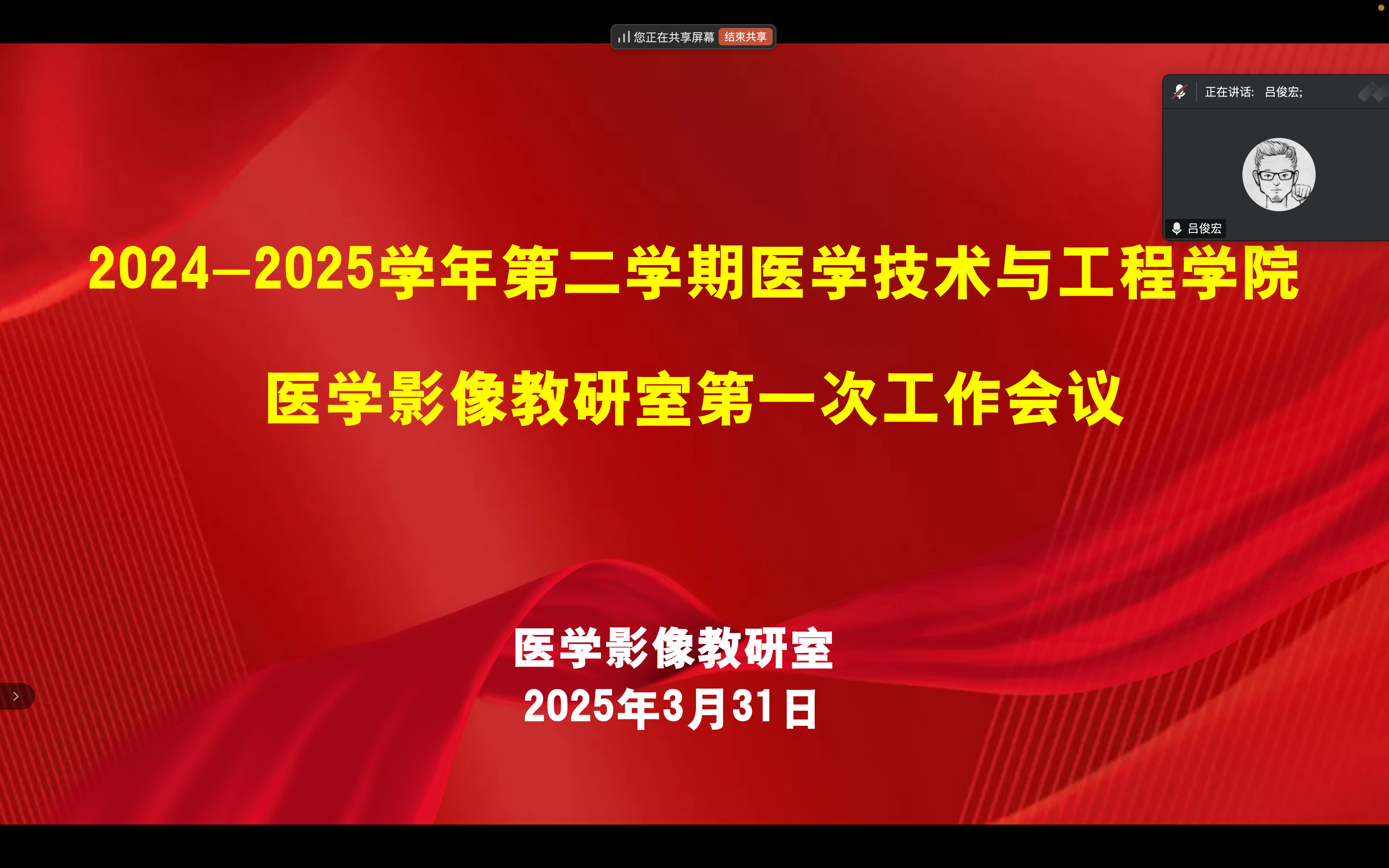 3月31日晚20:00~20:30,医学影像与智能医疗装备教研室于腾讯会议平台,召开了“2024-2025学年第二学期教研室工作会议”。会议由吕俊宏主持,教研室全体教师参加会议。