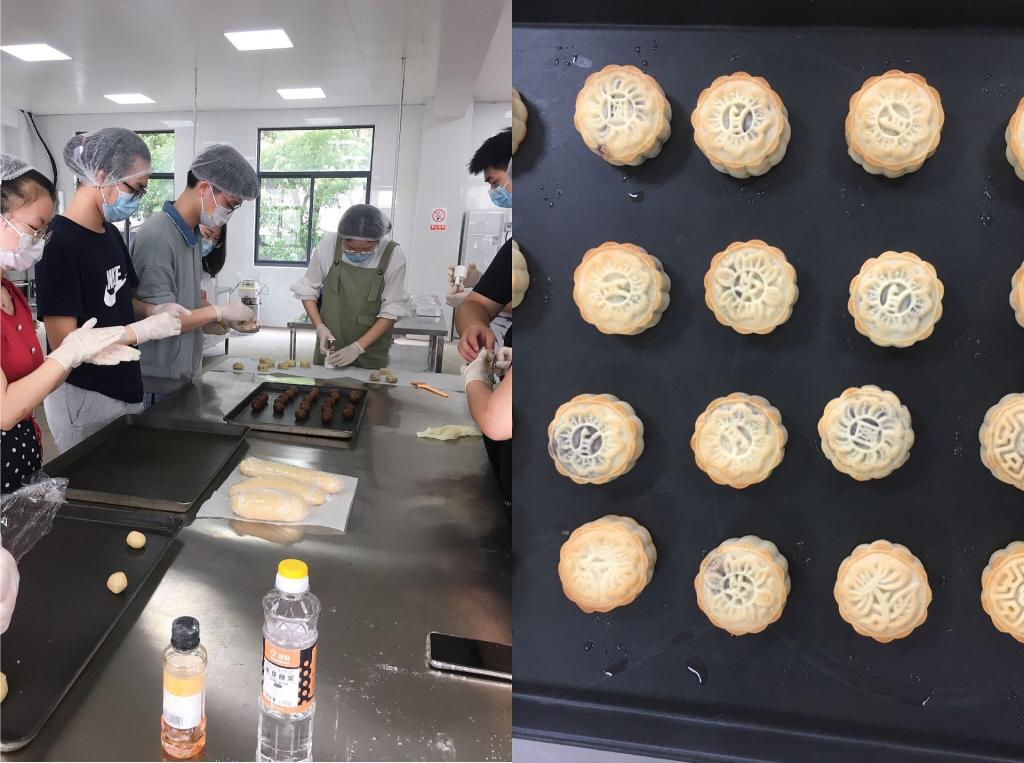 在接到制作月饼的通知后,导学员们便早早地忙碌了起来。在烘焙俱乐部同学们的指导下,甜糯的豆沙被饼皮完美包裹,在模具中变换千姿百态,将月饼置于200℃的烤箱中烤5分钟定型,然后取出刷上花生油,在180℃的烤箱中继续烘烤15分钟,香甜不腻的豆沙馅月饼就新鲜出炉了。一位导学员说:“外面卖的月饼或多或少加了许多添加剂,而这些月饼从饼皮到饼馅都是我们亲手准备的,以中筋粉、鸡蛋、糖浆、花生油为原料,和面、包馅、烘培,精心烤制,为了让学弟学妹们吃到健康美味的月饼,我们严守每一道工序,希望学弟学妹们会喜欢!”