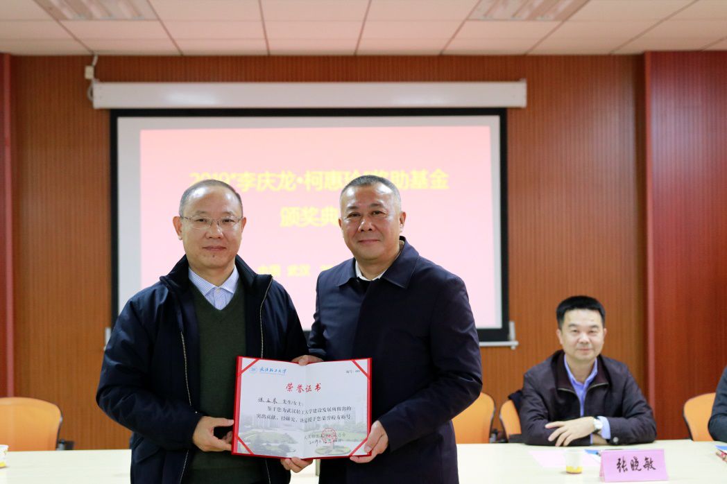 2017年11月6日湖南省玉峰食品实业有限公司和武汉轻工大学正式签订战略合作协议,达成战略合作关系,校企合作上升到了一个全新的层次。2018年在李庆龙教授、校党委和以张玉东先生为代表的企业家共同努力下,我校成立了“李庆龙·柯惠玲奖助基金”,主要用于奖励在食品学科品学兼优或科研能力突出的青年教师、研究生及本科生,张玉东先生获聘为第一届理事会理事长。2019年12月26日,在第二届“李庆龙•柯惠玲奖助基金”颁奖典礼上,校党委副书记刘丰林代表校友总会,向张玉东董事长颁发武汉轻工大学001号荣誉校友证书。