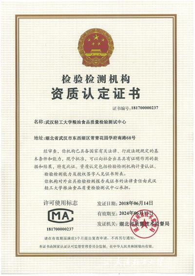 近日,我校粮油食品质量检验测试中心(以下简称“中心”)经严格审核正式获得湖北省质量技术监督局颁发的《检验检测机构资质认定证书》。