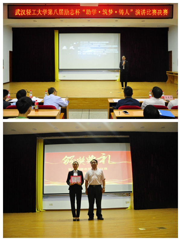 本报讯(食品学院 王娴)为激励学生在追求自己梦想的道路上不懈努力,奋力拼搏,懂得感恩与回报。2018年5月22日晚6:30,武汉轻工大学第八届励志杯“助学·筑梦·铸人”演讲比赛决赛于常青科学报告厅展开,莅临本次活动的嘉宾有马克思主义学院副教授、中国近现代纲要教研室主任杨华祥老师,党委统战部部长李斌斌老师,学工部部长李世峰老师、学生工作部副部长李辉老师,校团委书记刘竞老师及党委宣传部刘义老师。