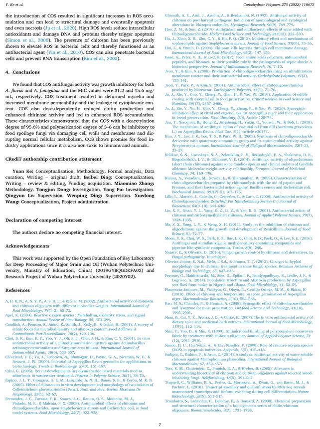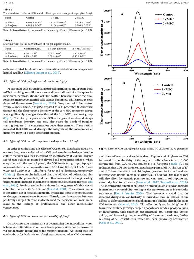 近日,武汉轻工大学食品学院谷物团队以“Study on inhibitory activity and mechanism of chitosan oligosaccharides on Aspergillus Flavus and Aspergillus Fumigatus”为题在Carbohydrate Polymers(Carbohyd. Polym. 275 (2022) 118673)上发表最新研究成果,报道了壳寡糖(COS)对腐败真菌的抑菌活性及抑菌机理的研究工作,为COS在食品贮藏领域的开发和应用提供理论和技术支撑。