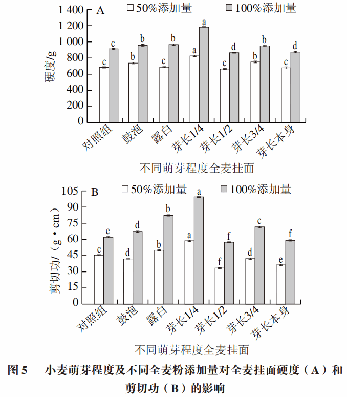 硬度及剪切功能反映煮后全麦挂面切断所需的力和所做的功。由图5可知,萌芽后期硬度降低,可能是蛋白及淀粉受到酶的分解,弱化面筋结构,导致煮后挂面变蹋软。随萌芽程度加深,50%及100%全麦挂面硬度及剪切功均呈现先增后降的趋势,并在芽长1/4阶段达到峰值。煮后挂面硬度与面筋网络结构连续性紧密相关。在小麦萌芽前中期,籽粒中淀粉及蛋白质分子尚未被大量酶解,面筋蛋白的连续性未被破坏,使挂面硬度增加,有利于煮后挂面劲道口感形成。50%全麦挂面的硬度及剪切功均低于100%全麦挂面,50%全麦挂面中萌芽小麦麸皮占比少,挂面持水力低导致硬度降低。综合而言,小麦萌芽在前中期有利于改善全麦挂面的硬度品质。