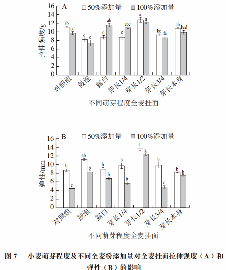 挂面的弹性能表征煮后挂面的延展性。由图7可知,50%和100%全麦挂面的拉伸强度及弹性均在芽长1/2萌芽阶段达到最高。拉伸强度及弹性与挂面面筋结构的稳定性有关,在小麦萌芽前中期,萌芽能带来麦麸吸水能力的增强,且淀粉及蛋白分子受酶解影响较低,面筋结构的连续性未受到破坏。此外,萌芽会也能使面筋拉伸能力增加,促使面团延展性增强。随着萌芽程度的增加,淀粉和面筋蛋白受酶解,导致挂面弹性有所降低。总体而言,芽长1/2萌芽阶段的全麦挂面弹性较好,一定程度下的萌芽有助于较好地改善全麦挂面的弹性。