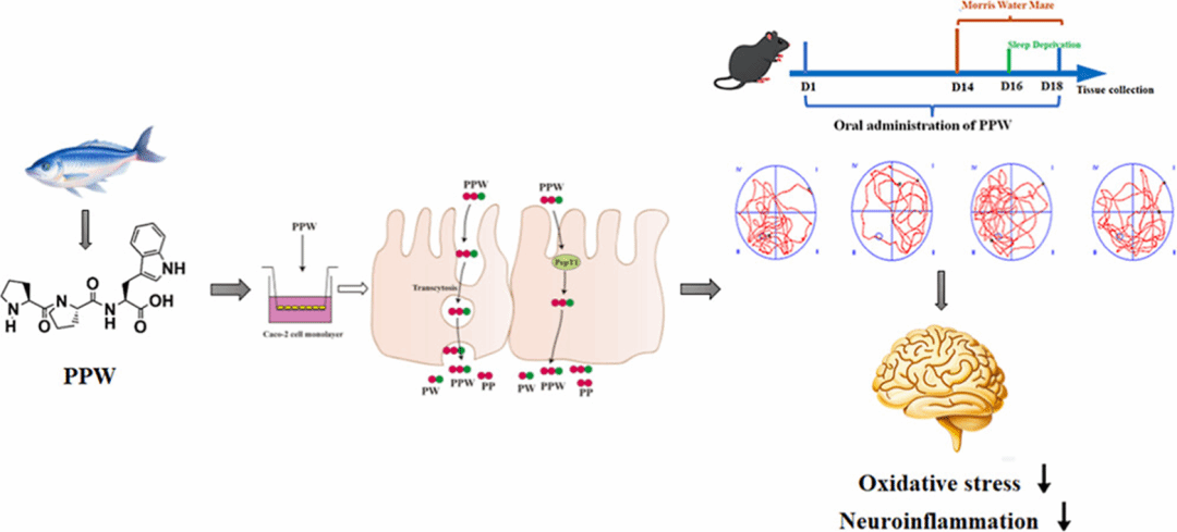睡眠不足正在成为现代社会的普遍问题。长期睡眠剥夺不仅影响情绪和注意力,还会诱发氧化应激和神经炎症,进而损伤学习记忆功能。寻找安全、可长期摄入、能够干预这一过程的食品活性成分,是食品科学与营养干预领域的重要方向。近期发表于 《Journal of Agricultural and Food Chemistry》 的一项研究,系统评估了来源于蓝圆鲹(Decapterus maruadsi)的一种三肽——Pro-Pro-Trp(简称 PPW)的神经保护潜力,为“功能食品干预认知损伤”提供了新的科学证据。
