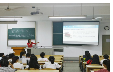 汪娴老师为新生们详细讲解了《研究生手册》中奖助学金评选办法和日常管理中的相关规定。此外,她还提出研究生应该具备沟通能力,并就如何培养和提高沟通能力展开宣讲,通过情景模拟、现场提问等方式,让现场的同学们体会到“高效沟通”的重要性。随后,她鼓励新同学们积极参与到各级学生组织中,勇于承担社会工作,敢于奉献青春激情。她说:“舞台再大,你不上台,就永远是个观众;平台再好,你不参与,就永远是个局外人。”