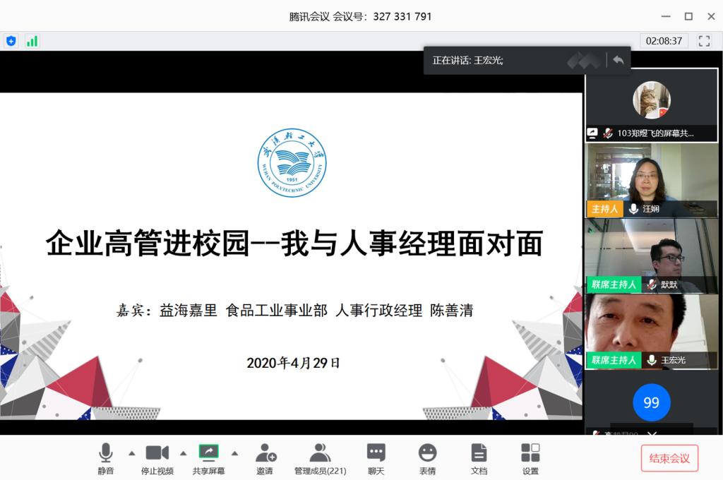 为深入贯彻落实习近平总书记关于做好高校毕业生就业工作的重要批示指示精神,进一步做好疫情防控期间研究生就业指导和职业规划指导工作,4月29日,食品学院与益海嘉里食品工业事业部联合举办了“云上”求职交流活动,益海嘉里食品工业事业部人事行政经理陈善清、食品学院党委书记王宏光、研究生辅导员汪娴及全院研究生参加了本次活动。