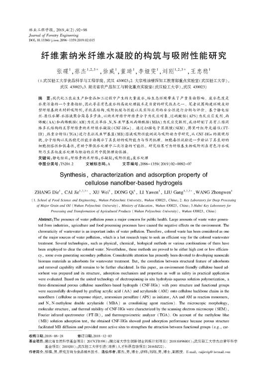 据了解,上述研究得到了湖北省大学生创新创业训练计划(201810496001),中国科协“青年人才托举工程”项目(2018QNRC001)和湖北省“楚天学者计划”等项目资助。《纤维素纳米纤维水凝胶的构筑与吸附性能研究》一文则是项目研究成果之一。