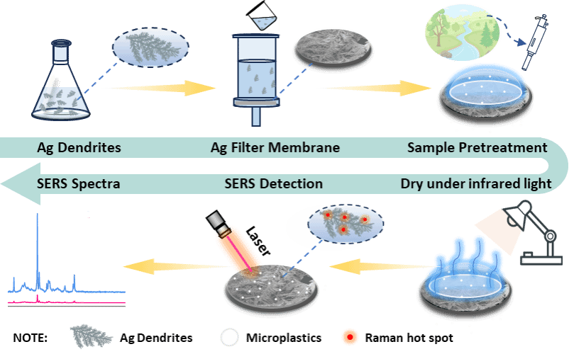 Microplastics (MPs) are emerging environmental pollutants that are present in aquatic environments and accumulate within the food chain, posing significant threats to human health. Over 8 million tons of MPs enter these ecosystems annually. However, existing rapid qualitative and quantitative analytical methods for trace MPs are limited, hindering comprehensive research on their impact in water environments. This study presents a novel composite membrane with both adsorption and filtration functions, integrated with surface enhanced-Raman scattering technology for detecting trace MPs in water. The silver dendrites, modified with n-hexanethiol and loaded onto filter paper, facilitate enhanced enrichment and simultaneous sensitive detection of MPs. The composite membrane exhibited excellent retention rates for standard polystyrene (PS) MPs of various sizes (200, 500, and 1000 nm), achieving high enrichment efficiency. Sensitive detection was realized with a linear response in a concentration range of 0.01 to 0.5 g/L, yielding optimal enhancement factors exceeding 2.92 × 103, enabling detection at μg/L levels. Recovery rates for PS in spiked environmental water samples ranged from 96.86 % to 102.96 %. This innovative method offers a promising approach for the rapid and sensitive detection of trace MPs in aquatic environments, contributing significantly to the assessment of MPs pollution.