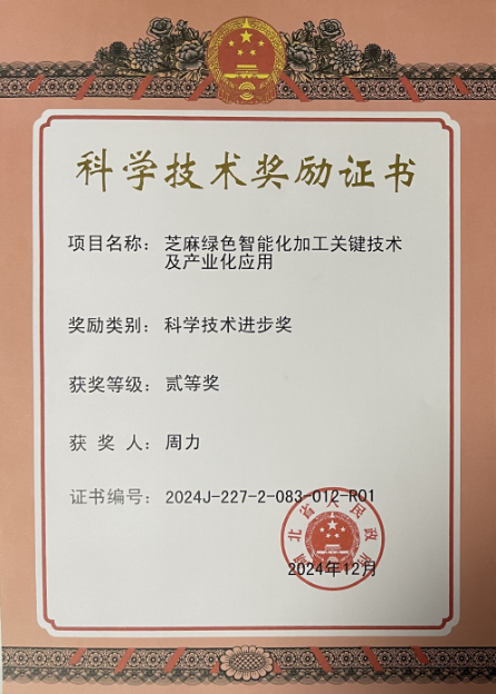 该项目承担国家及省部级课题4项;制修订《芝麻油》等5项国家和行业标准;获得国家授权专利71项,其中发明专利10项;发表论文66篇;出版著作2部;取得科技成果评价7项,整体技术达到国际先进水平;培养研究生12名。成果已在湖北、河南、上海、山东、重庆、河北等11家芝麻加工头部企业实现产业化应用,其中3家为中国芝麻加工“10强“企业,2家为企业标准领跑者,科技成果主要应用的企业近3年销售额141.32亿元,新增利润15.55亿元,新增税收1.58亿元,取得了显著的经济和社会效益。项目获得2024年湖北省科学技术进步奖二等奖。