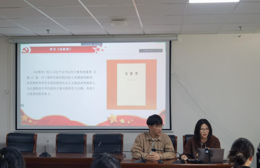 然后领学员带领大家学习收录习近平总书记关于教育文稿的书籍《论教育》。习近平同志围绕教育发表的一系列重要论述,科学回答了“培养什么人、怎样培养人、为谁培养人”的根本问题,深化了对我国教育事业的规律性认识,对于新时代新征程办好人民满意的教育,全面贯彻党的教育方针,培养德智体美劳全面发展的社会主义建设者和接班人,为全面推进中华民族伟大复兴提供有力支撑,具有十分重要的指导意义。