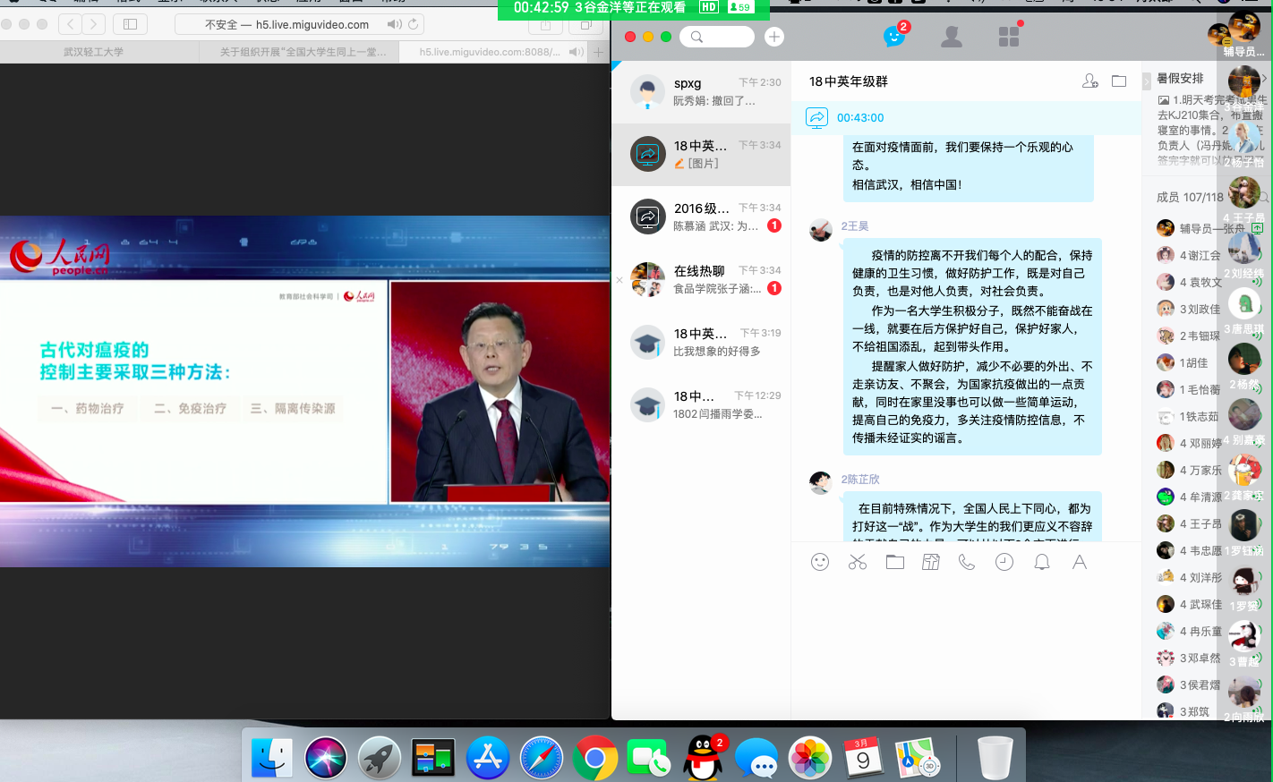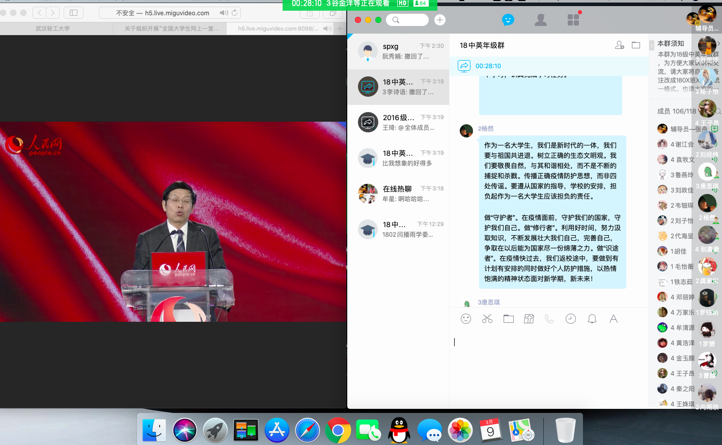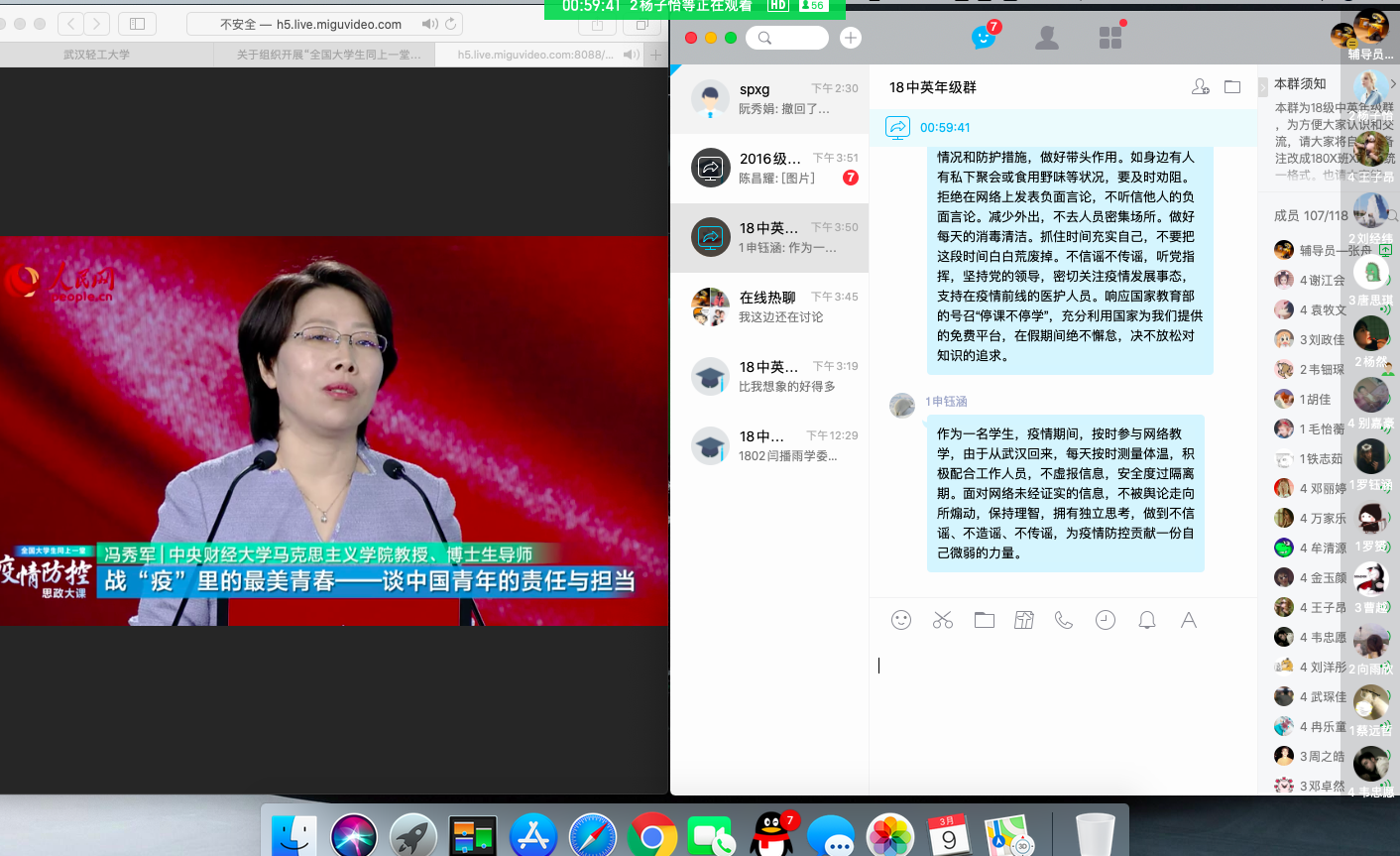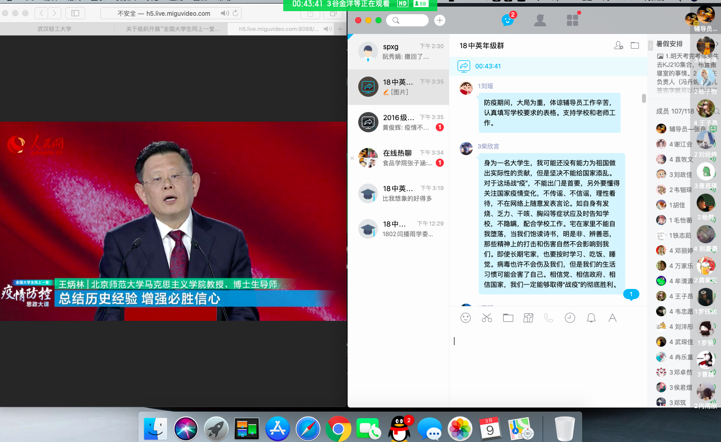为积极应对新冠肺炎疫情,充分发挥思想政治教育在“抗疫”工作中的引领作用,2018级中英班结合《全国大学生同上一堂疫情防控思政大课》,利用视频直播和屏幕分享等方式,组织进行了别开生面的年级班会。