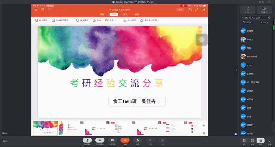 为指导学生明确考研目标,合理规划,4月17日下午3点,食品学院举办了线上考研经验交流分享会,17级辅导员阮秀娟老师、16级考研同学祝汝意、邹开翔、周圆清、吴佳卉与17级百余名同学分享考研经验和技巧。