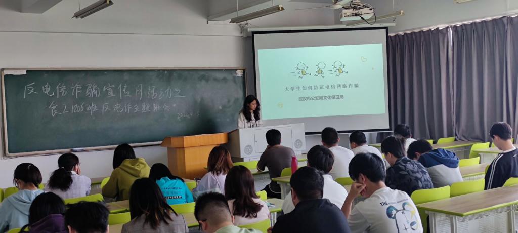 通报诈骗警情后,各班在班会上还集中学习了武汉市公安局文化保卫局制作的《大学生如何防范电信网络诈骗》、《校园防骗微课堂》PPT,食工1808班班长余健结合PPT对同学们再三叮嘱:“对于网上中奖、投资、赌博平台、聊天工具诈骗的常见网络诈骗要提高警惕,做到不贪图便宜,拒绝私下交易;现在新型的诈骗方式频出,遇到诈骗事件要做到不慌张、冷静处理,第一时间报警并告知辅导员。”