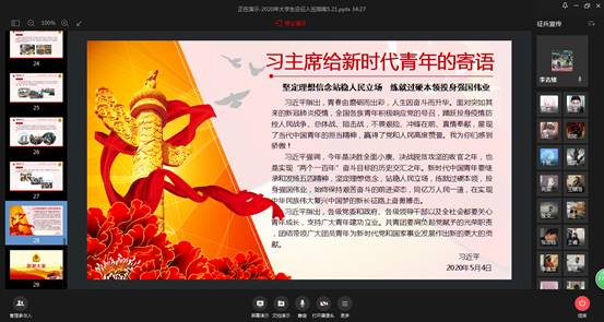 李老师还给同学们介绍了军旅生活风貌,展示了军人的着装、饮食、住宿、文体等方面的部分图片,并引用了习近平主席在五四青年节的讲话:“习近平指出,各级党委和政府、各级领导干部以及全社会都要关心青年成长,支持广大青年建功立业。共青团要肩负起党赋予的光荣职责,团结带领广大团员青年为新时代党和国家事业发展作出新的更大的贡献。” 来鼓励同学们积极响应国家号召入伍。